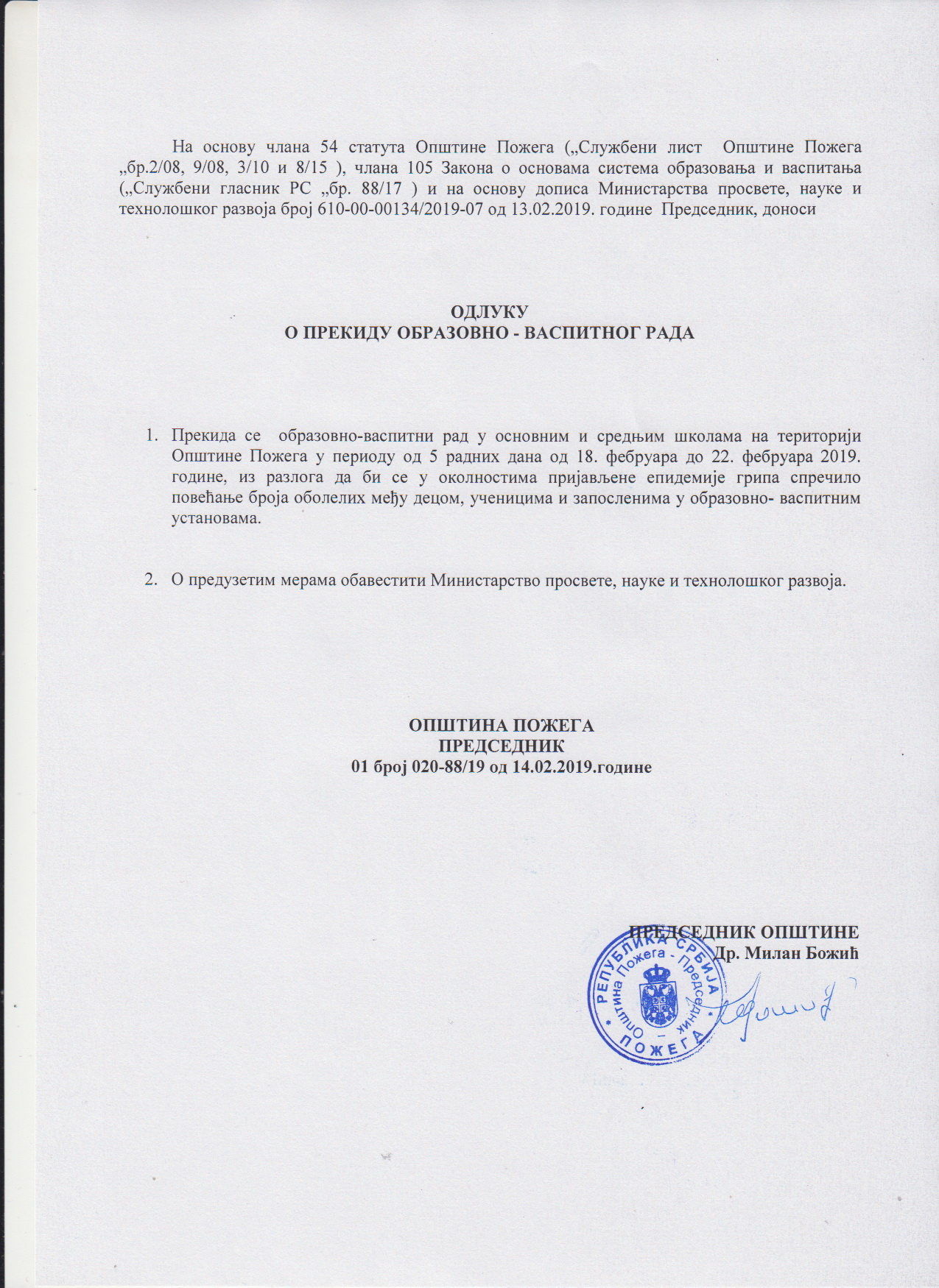 На основу члана 54. статута Општине Пожега ("Сл. лист Општине Пожега" бр. 2/08, 3/10 и 8/15), члана 105 Закона о основама система образовања и васпитања ("Сл. гл. РС" бр 88/17) и на основу дописа Министарства просвете, науке и технолошког развоја број 610-00-00134/2019-07 од 13.02.2019. године, Председник доноси Одлуку о прекиду образовно-васпитног рада 1. Прекида се образовно-васпитни рад у основним и средњим школама на територији општине Пожега у периоду од 5 радних дана, од 18. фебруара до 22. фебруара 2019. године, из разлога да би се у околностима пријављене епидемије грипа спречило повећање броја оболелих међу децом, ученицима и запосленима у образовно-васпитним установама. 2. О предузетим мерама обавестити Министарство просвете, науке и технолошког развоја.