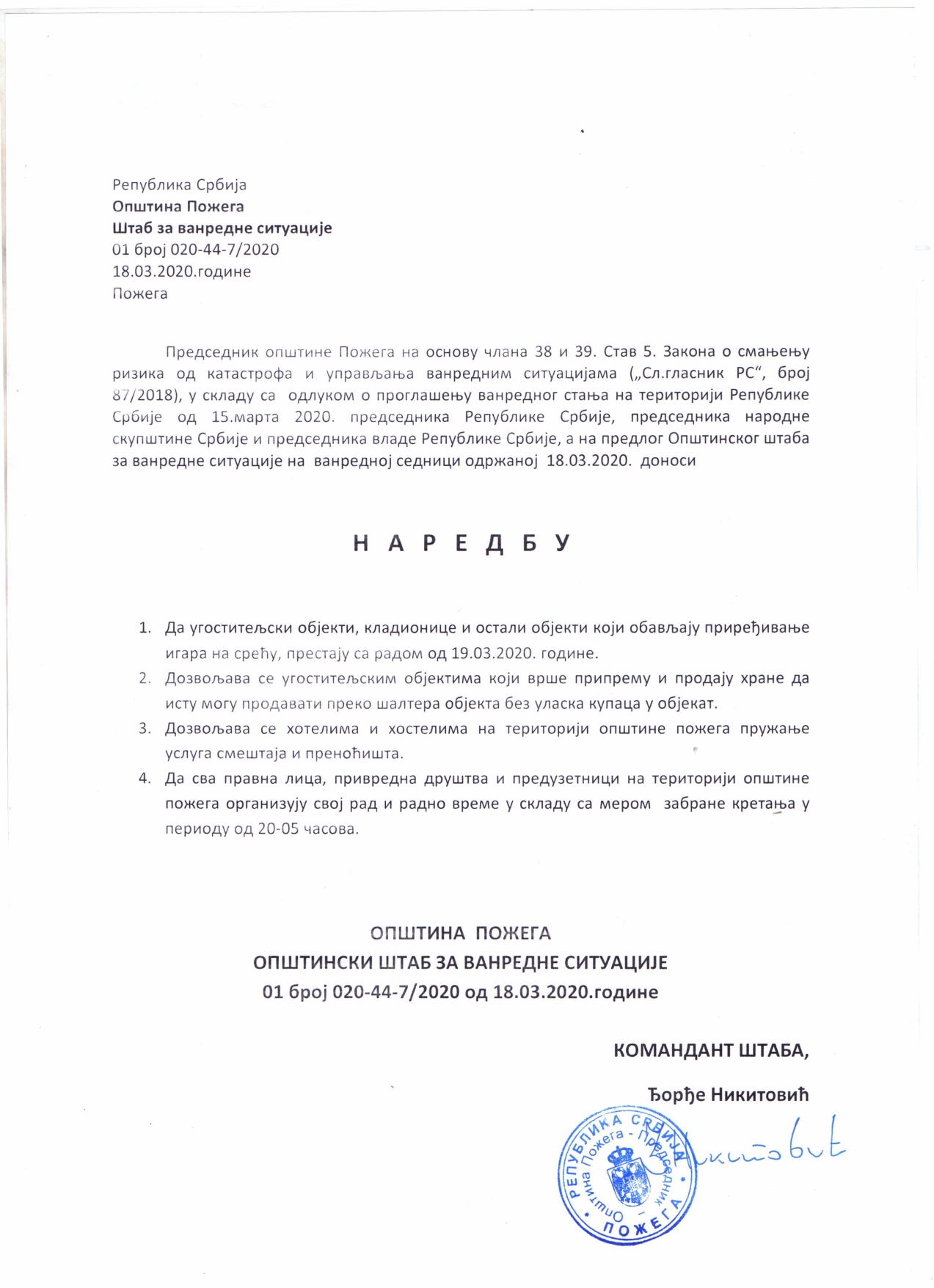 | Штаб за ванредне ситуације - Наредба 18.03.2020.