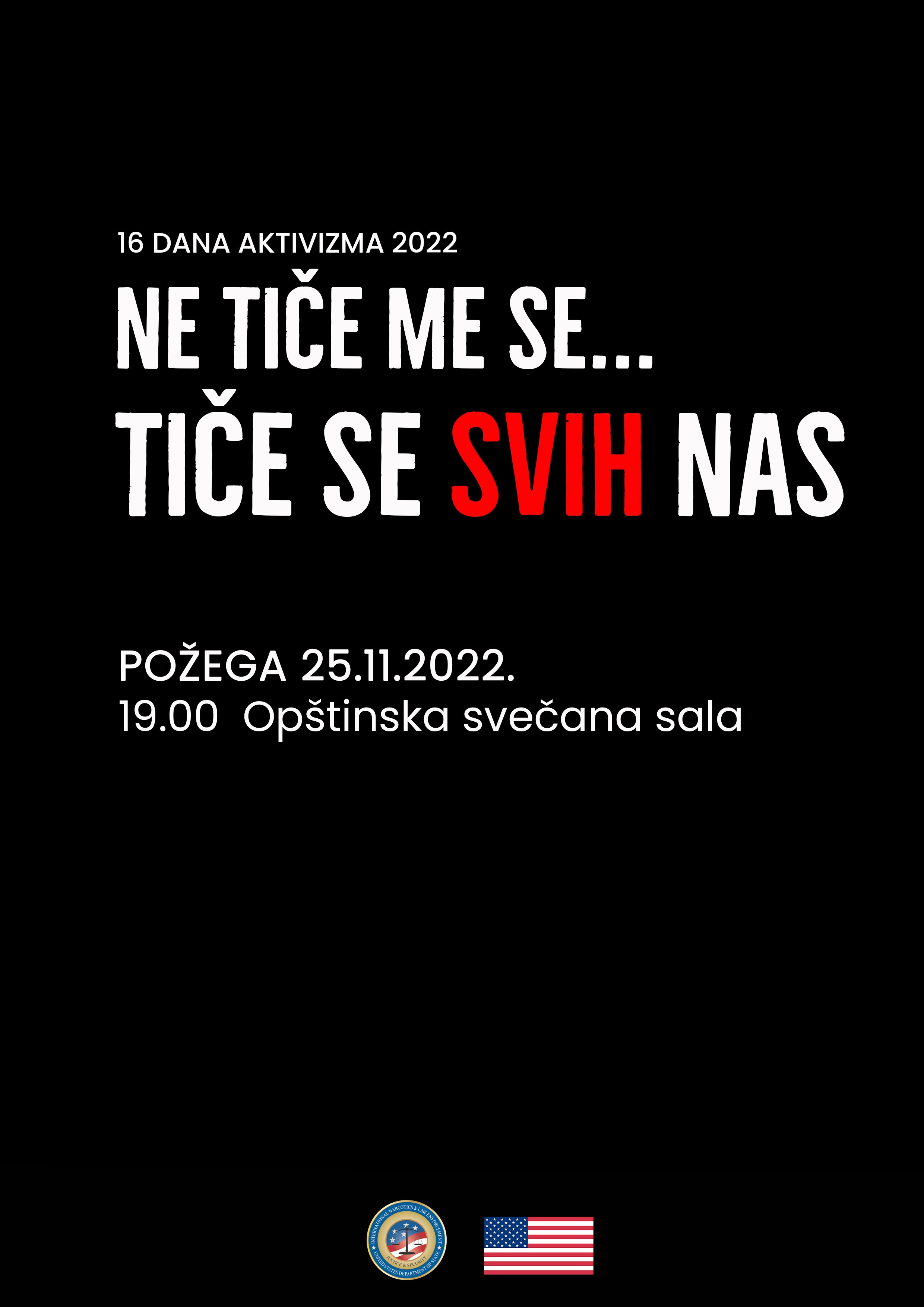 Поштовани суграђани, 25. новембра свет обележава Међународни дан борбе против насиља над женама и почетак шеснаестодневне глобалне кампање „16 дана активизма против насиља над женама“ у којој учествује више од 100 држава света и преко 1.700 организација. Кампања коју спроводи Амбасада Сједињених Америчких Држава обухвата још три важна међународна датума, а завршава се 10. децембра на Међународни дан људских права. У циљу подизања свести о овој осетљивој теми, Основни суд у Пожеги је подржао поменуту кампању и организовао приказивање документарног филма „Не тиче ме се... Тиче се СВИХ нас“ који се бави овом тематиком управо на Међународни дан борбе против насиља над женама – 25. новембра 2022. године, са почетком у 19 часова, у свечаној сали Општине Пожега. Како смо сви део наше заједнице и једнако дужни да сваког појединца штитимо од насиља и једнако обавезни да не ћутимо, позивамо вас да присуствујете пројекцији наведеног документарног филма. С поштовањем,