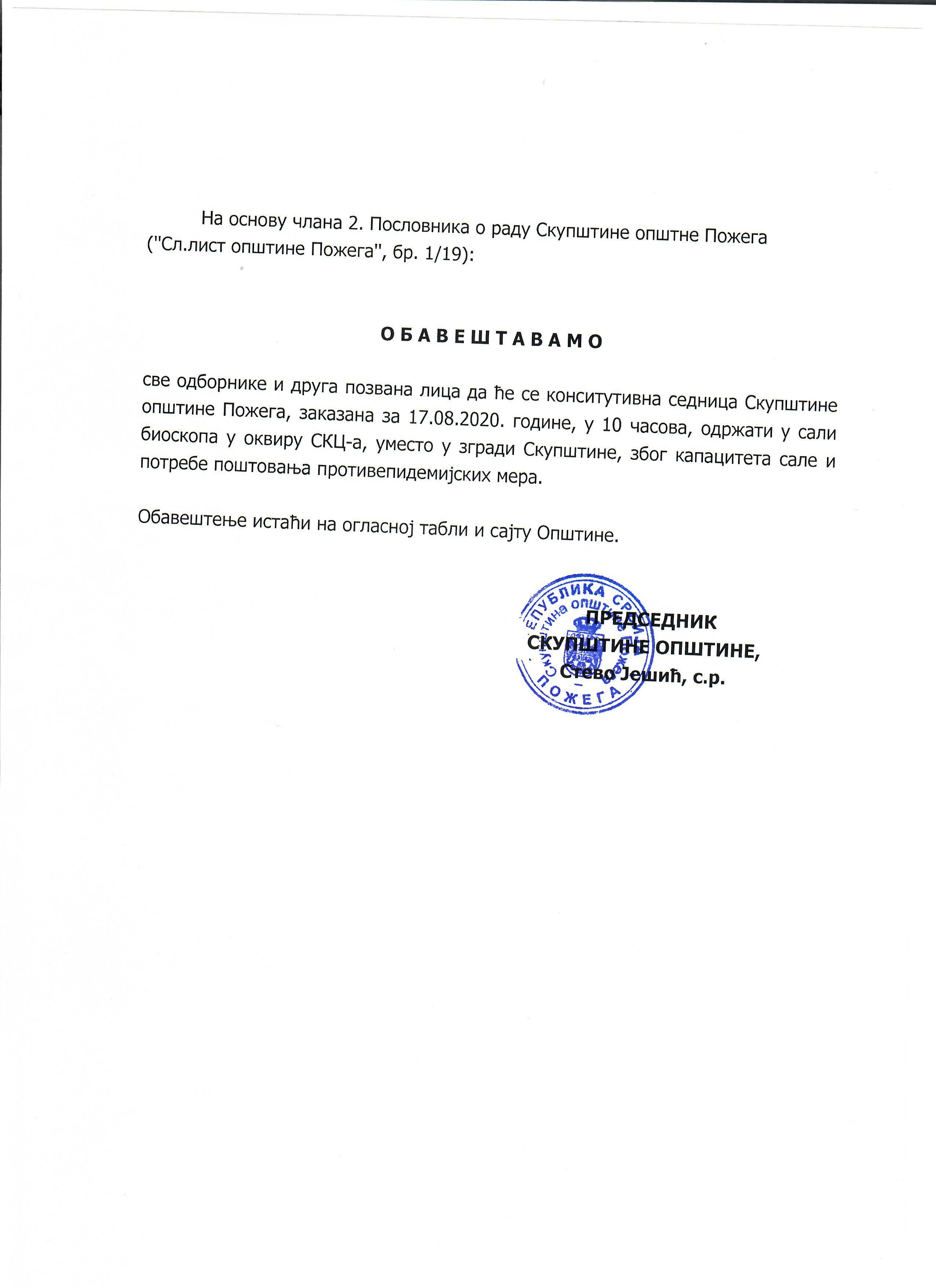 На основу члана 2. Пословника о раду Скупштине општне Пожега (''Сл.лист општине Пожега'', бр. 1/19): О Б А В Е Ш Т А В А М О све одборнике и друга позвана лица да ће се конститутивна седница Скупштине општине Пожега, заказана за 17.08.2020. године, у 10 часова, одржати у сали биоскопа у оквиру СКЦ-а, уместо у згради Скупштине, због капацитета сале и потребе поштовања противепидемијских мера. Обавештење истаћи на огласној табли и сајту Општине. ПРЕДСЕДНИК СКУПШТИНЕ ОПШТИНЕ, Стево Јешић, с.р. Обавештење - Преузми |